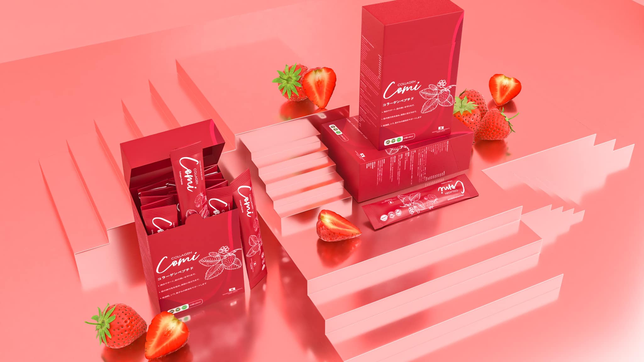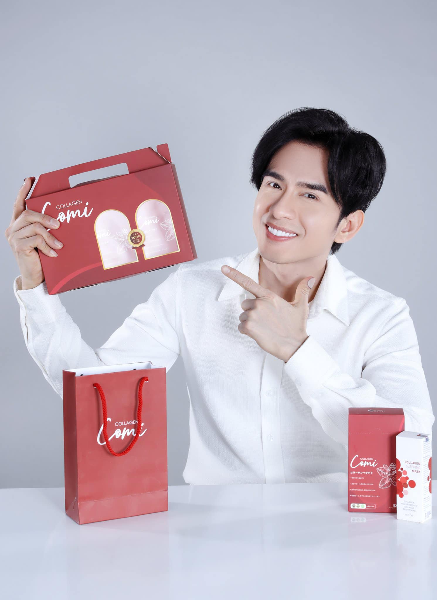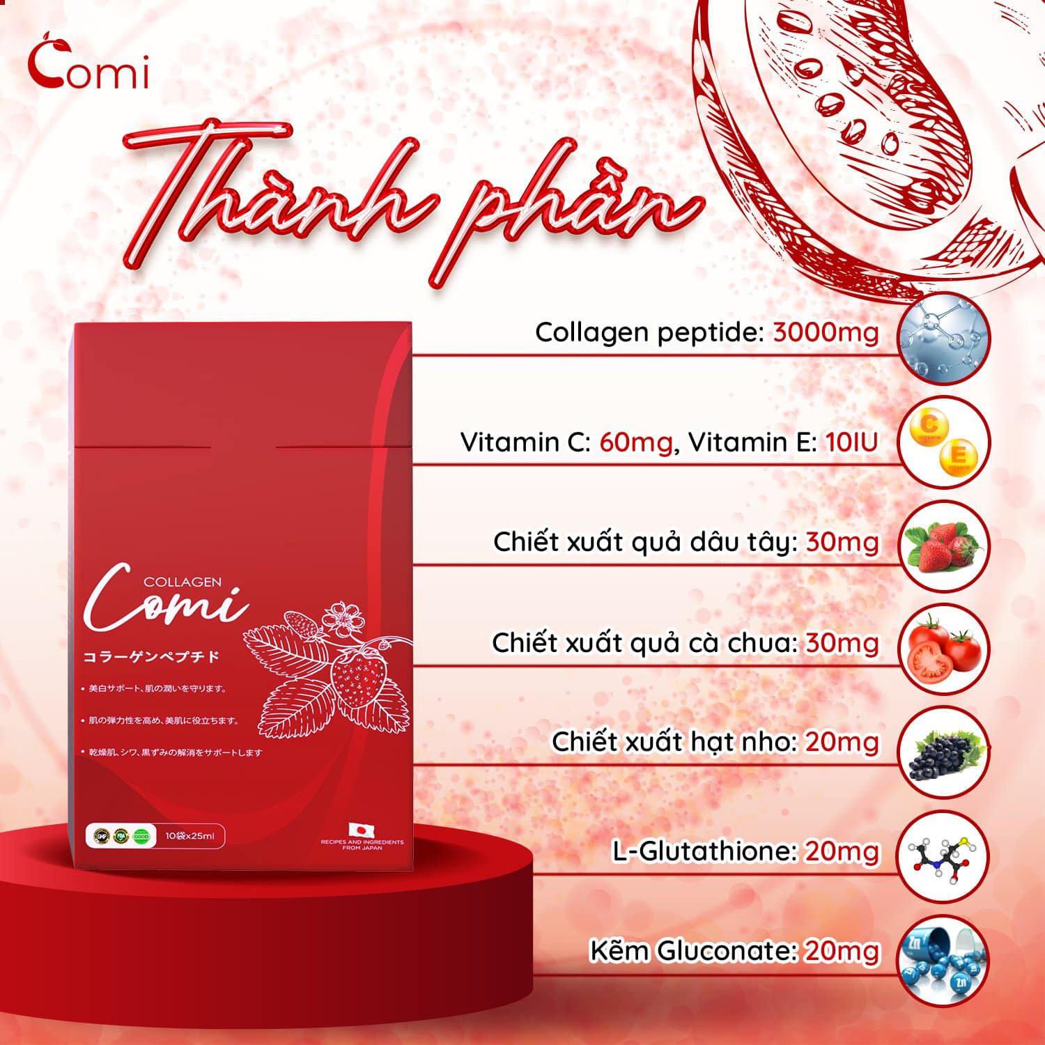 Collagen comi với công nghệ thủy phân collagen peptit độc quyền từ Nhật Bản thành phần là sự kết hợp Collagen peptit (collagen phân tử nhỏ rất dễ hấp thụ), chiết xuất dâu tây, cà chua, Vitamin E,C, HA (cấp ẩm và giữ nước trên da gấp 1000 lần) , L-Gluthanion ( giúp Trắng da, loại bỏ hắc sắc tố melanin từ sâu bên trong).