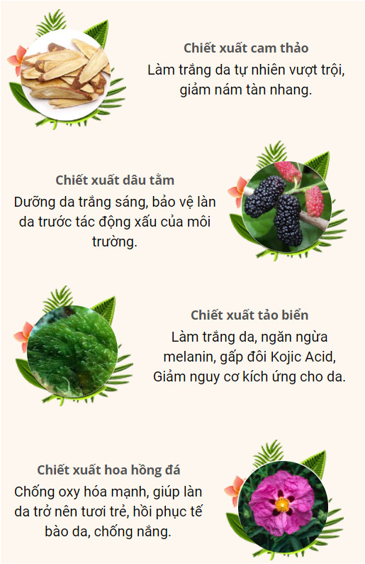 - Chiết xuất cúc la mã: chống kích ứng, kháng khuẩn, chống viêm, không gây dị ứng, làm dịu da, cân bằng độ ẩm pH, trị mụn.