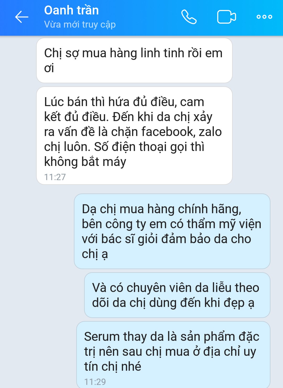 Rất nhiều khách hàng mua hàng trôi nổi xài không hiệu quả, xài xảy ra những vấn đề về da và kiếm đến người bán thì họ chặn facebook, zalo, hoặc không chịu trách nhiệm, và cũng không biết người bán là ai.
